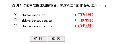 请选择您需要的域名,然后点击"注册"按钮进入资料填写页面。
