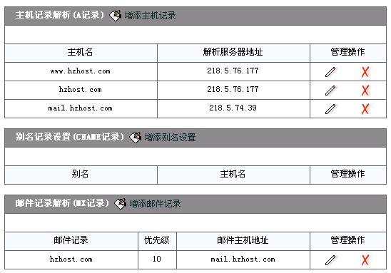 现以域名hzhost.com为例,要使mail.hzhost.com能够正常收发信,应该执行两个操作,一个是把mail.hzhost.com解析到企业邮局所在服务器的IP地址上(假设为218.5.74.39),另一个则是增添邮件交换记录。