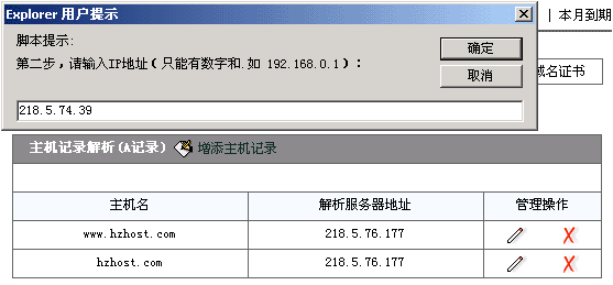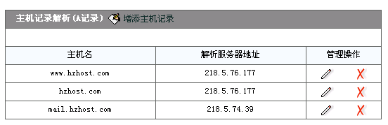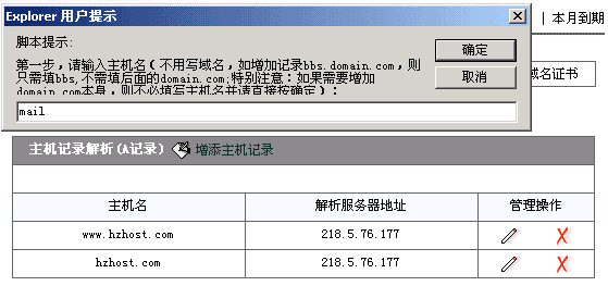 2>我们首先来解析mail.hzhost.com到IP:218.5.74.39。 点击"增添主机记录",然后在弹出的框内输入"mail",注意,不能输入"mail.hzhost.com"。如下图所示: